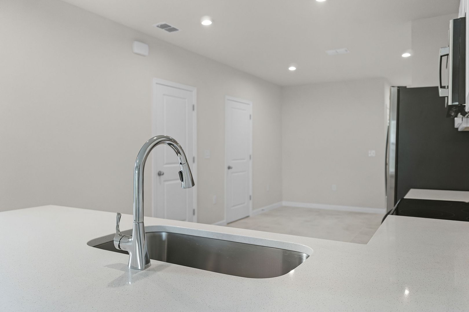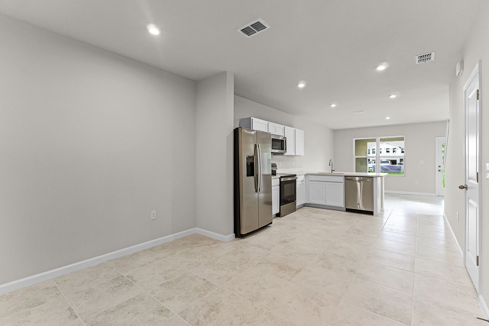 Inside, the open-concept layout features durable tile flooring throughout the entire downstairs, recessed lighting, crisp white shaker cabinetry, sparkling quartz countertops, and brand-new stainless steel appliances. A pantry and convenient half bath complete the first floor.