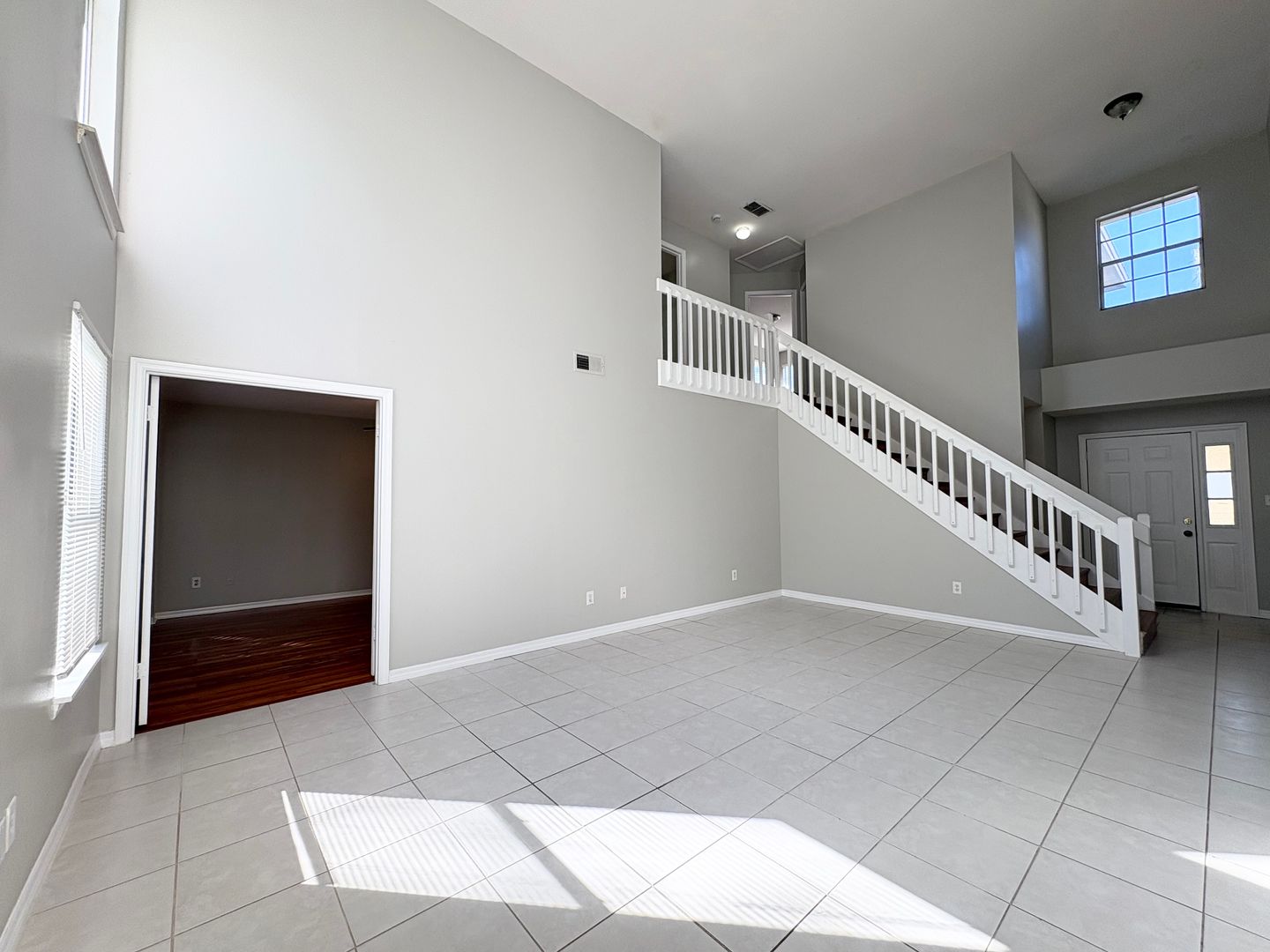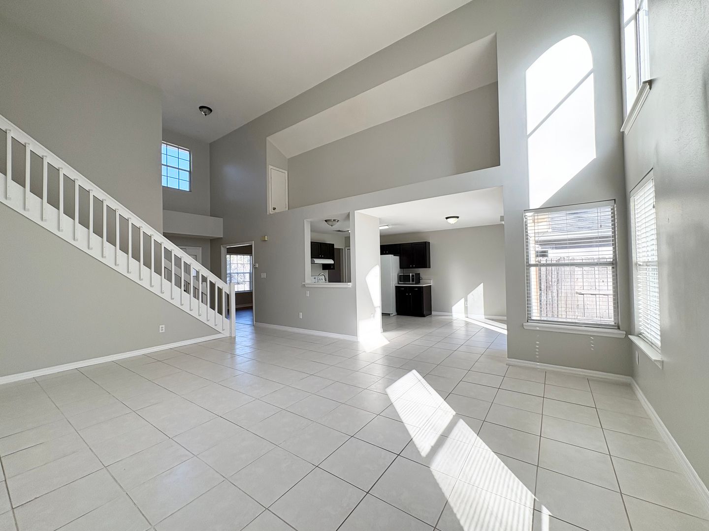 The family room is oversized, with two story ceilings and large windows, allowing for lots of natural light.