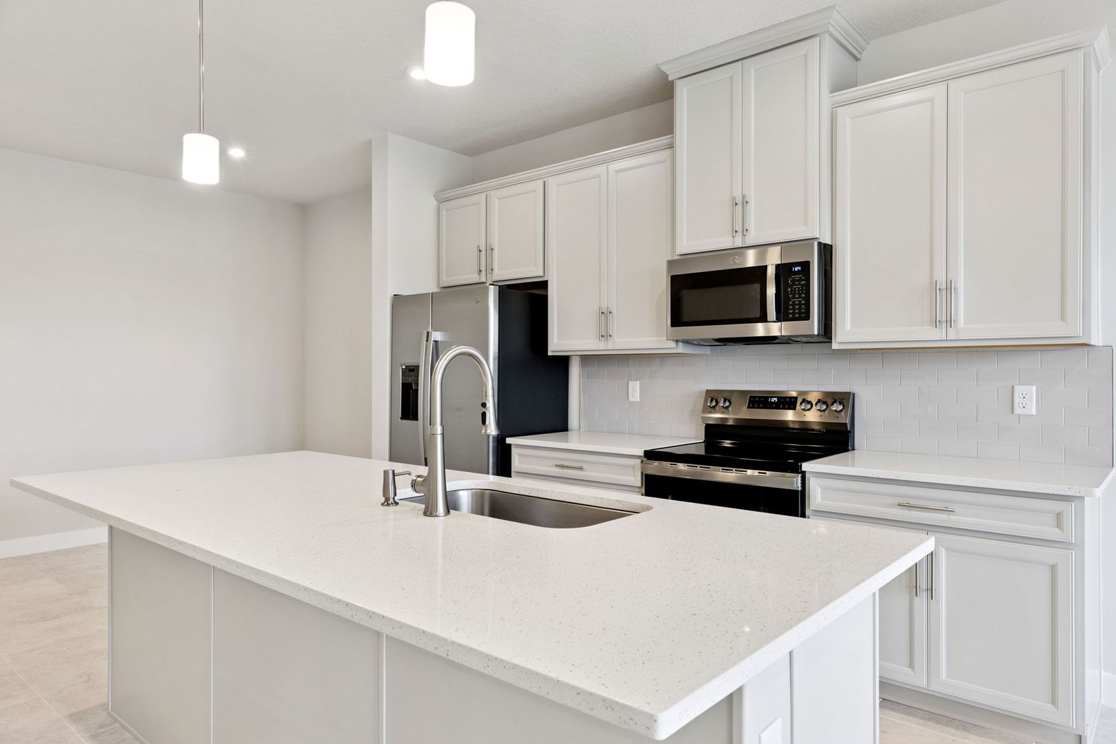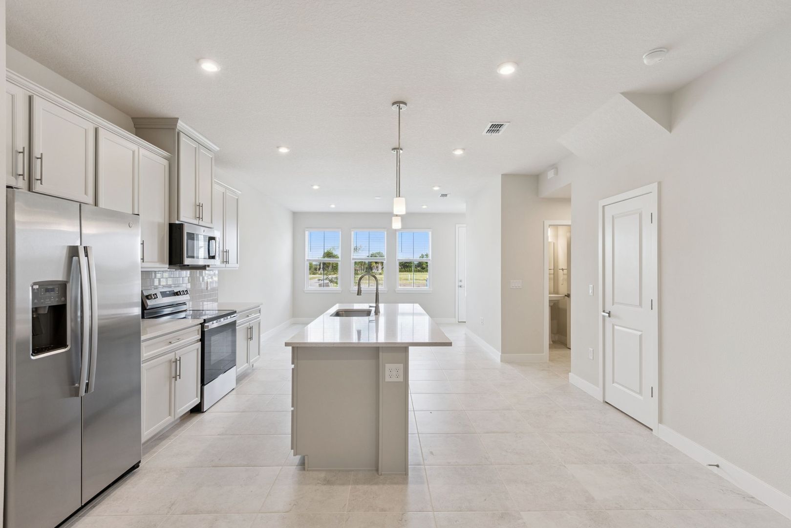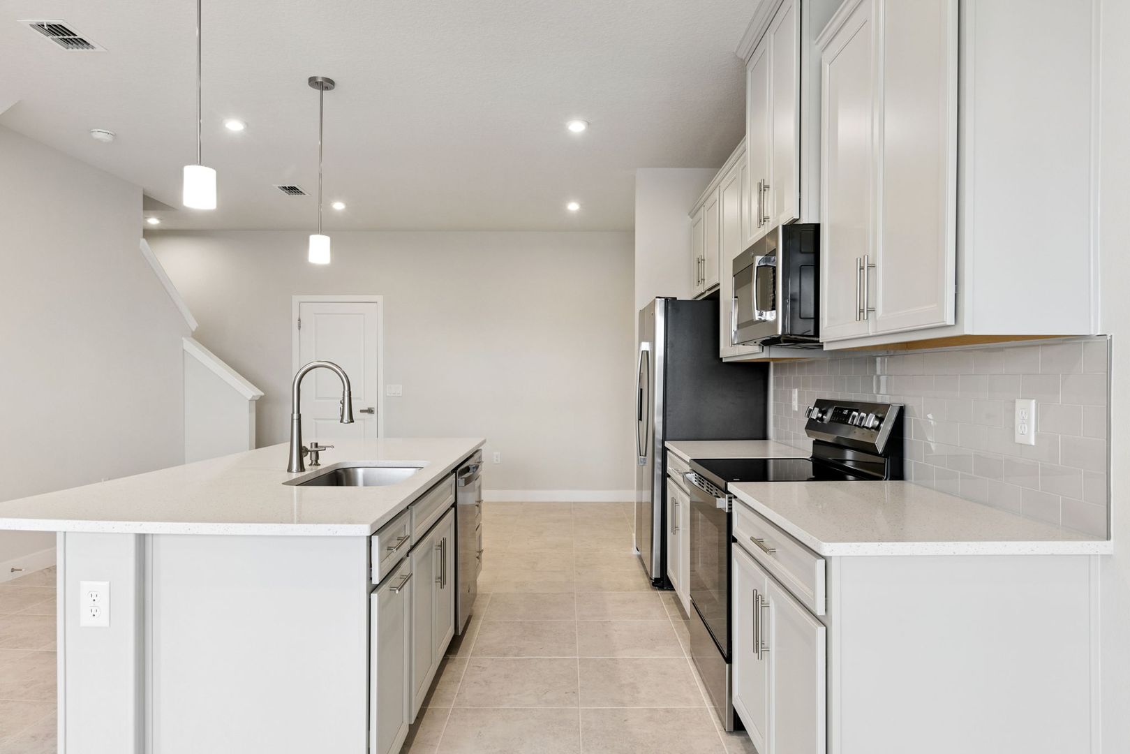 On the main level, a beautifully designed kitchen features 42" cabinetry with crown molding, quartz countertops, subway tile backsplash, and a center island that flows seamlessly into the dining and family areas. Neutral tile flooring throughout the downstairs offers easy maintenance and the space is complemented by abundant natural light for a bright and airy feel.