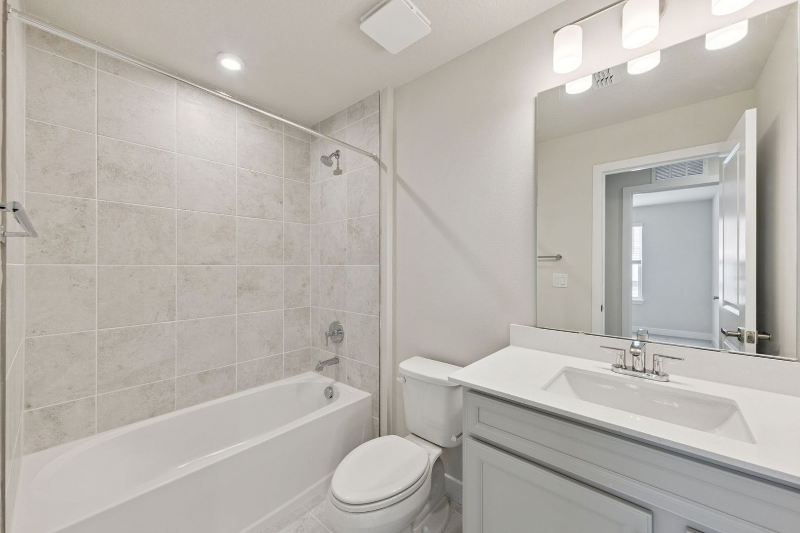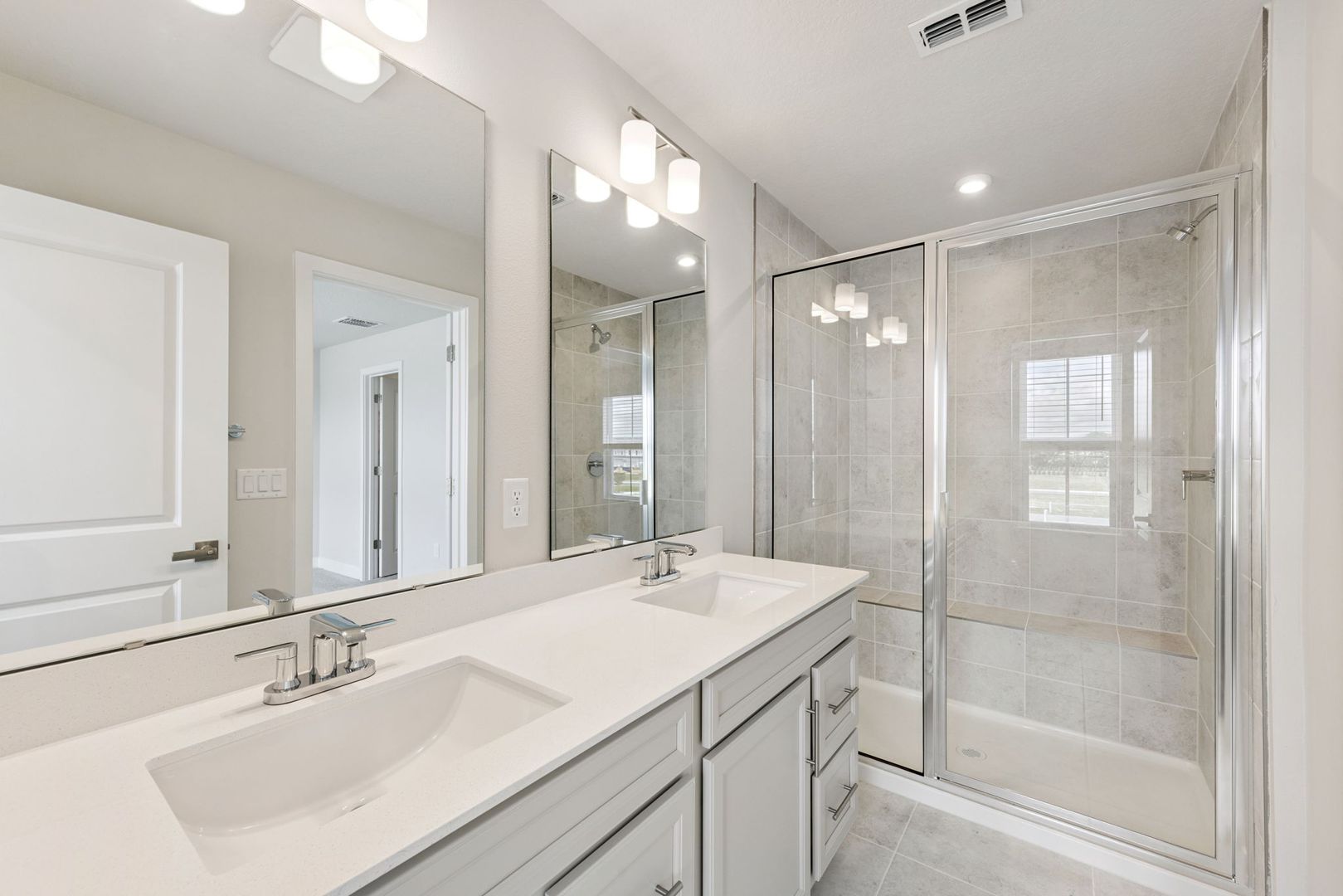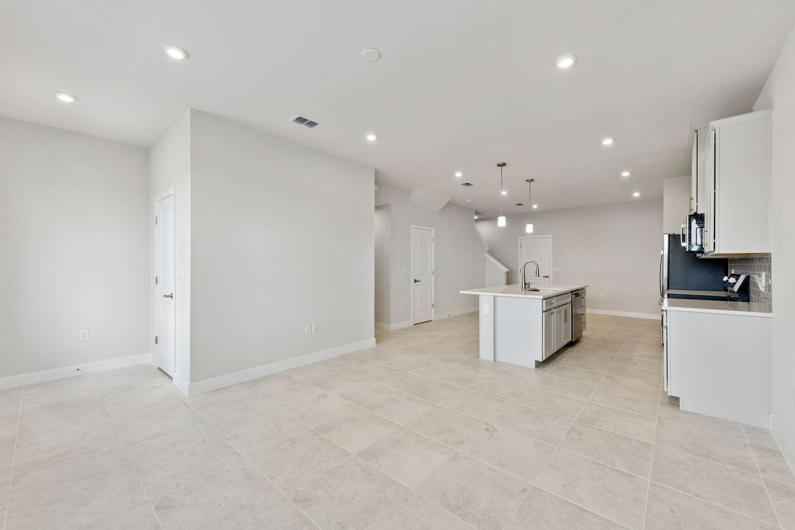 On the main level, a beautifully designed kitchen features 42" cabinetry with crown molding, quartz countertops, subway tile backsplash, and a center island that flows seamlessly into the dining and family areas. Neutral tile flooring throughout the downstairs offers easy maintenance and the space is complemented by abundant natural light for a bright and airy feel.