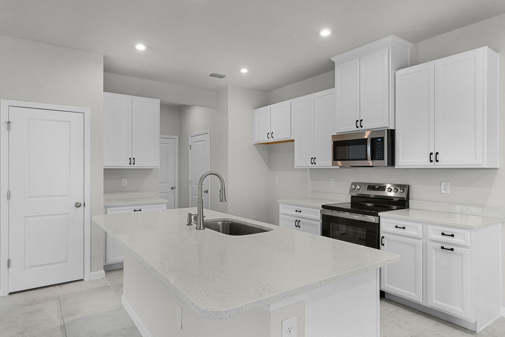 Experience spacious two-story living with this beautifully designed Hillcrest floor plan, offering 4 bedrooms, 2.5 bathrooms, and a 2-car garage. Downstairs, enjoy all-tile flooring, volume ceilings, and an abundance of natural light that fills the open living spaces. The modern kitchen is a standout, featuring sleek white cabinetry, quartz countertops, brand-new stainless steel appliances, and a generous walk-in pantry—perfect for both everyday meals and entertaining.