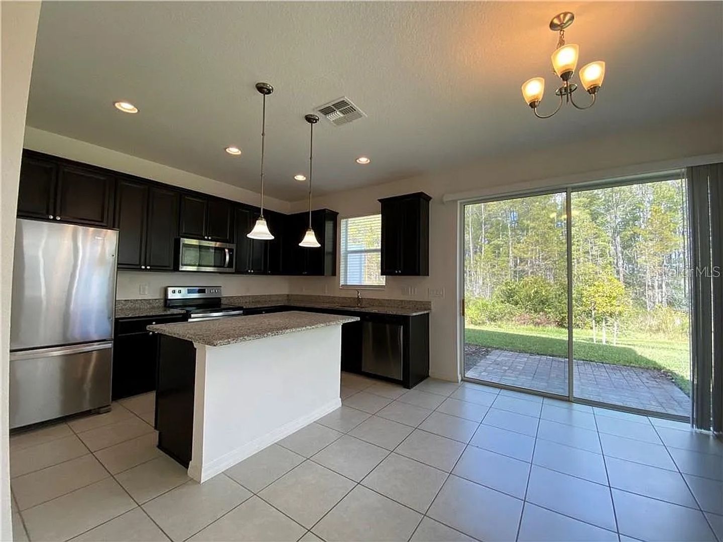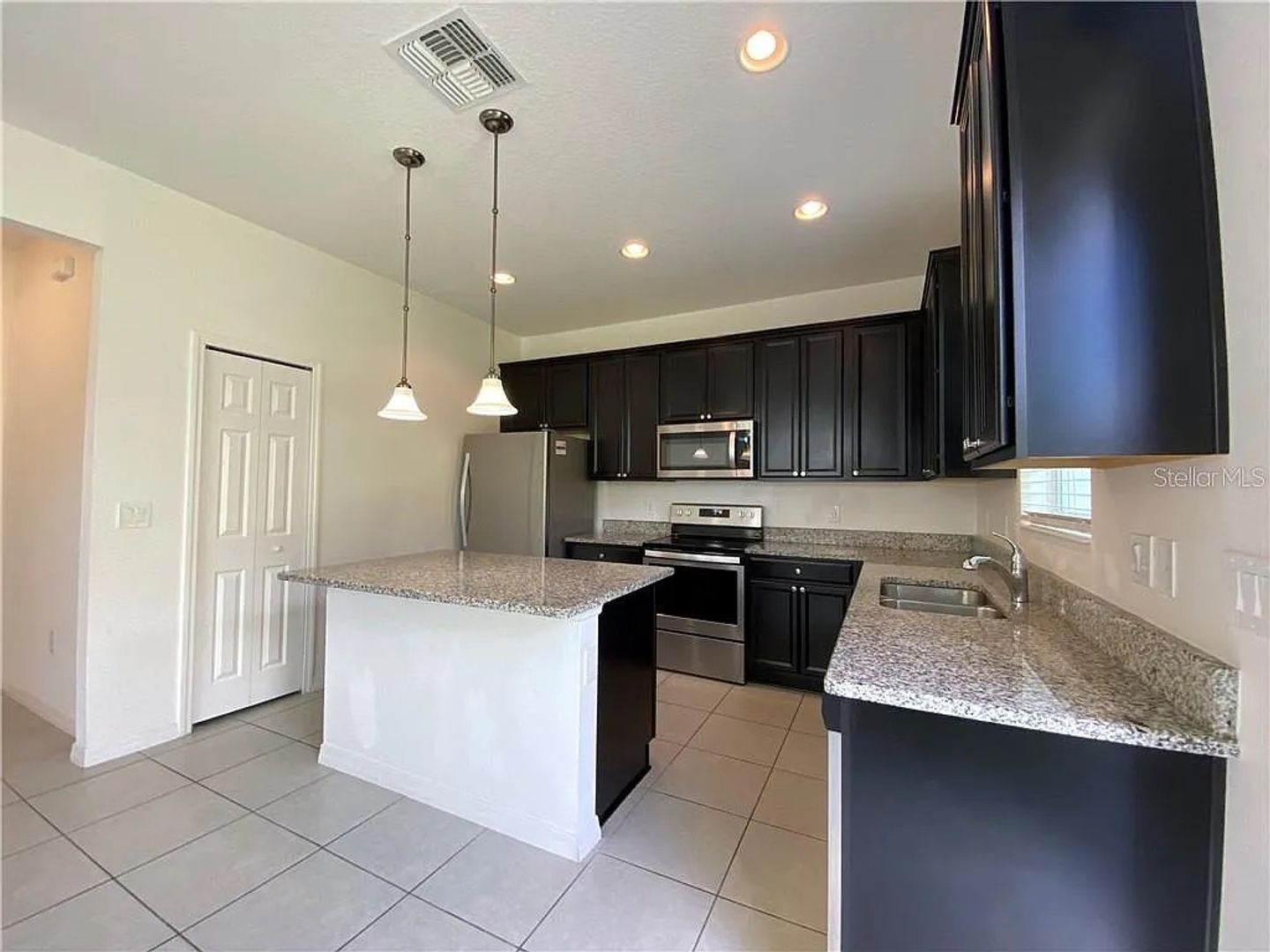 Step inside to an open floor plan with 9-ft ceilings and abundant natural light. The first floor features ceramic tile throughout the living, dining, and kitchen areas. The gourmet kitchen includes 42" cabinetry with crown molding, granite countertops, a spacious island with bar seating, stainless steel appliances, a closet pantry, and plenty of storage and prep space.